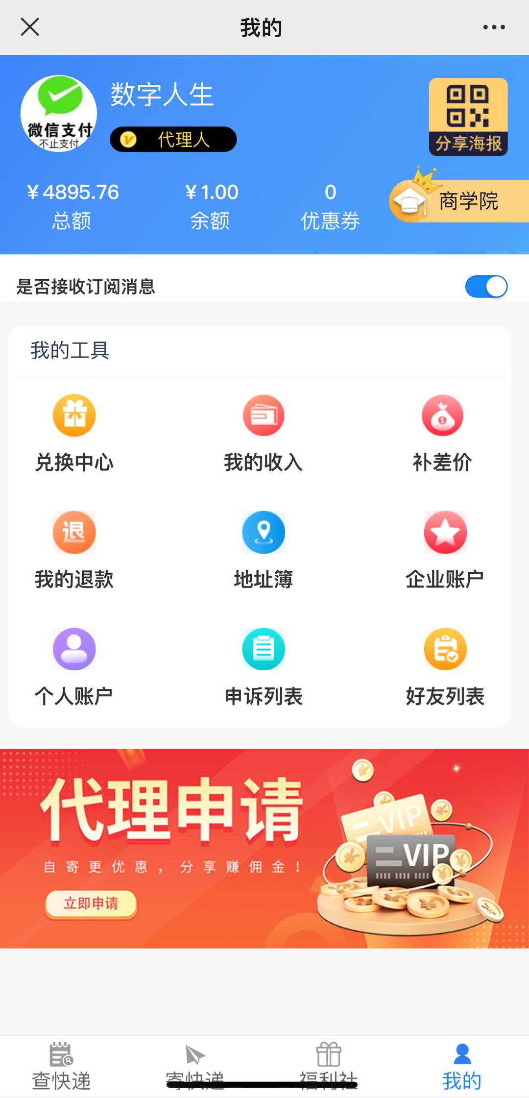 快递代理分哪些类型?:公众号代理申请一个微信服务号,我们帮您接入快递下单、查询系统,您只需每月发四次公众号推文,宣传推广自己的公众号即可。如果您已经有了一个服务号,我们也可以帮您接入快递服务入口,相当于新增一个流量入口。用户只要通过该公众号入口下单,您即可获得佣金。:微信小程序代理注册并申请一个微信小程序,我们帮您接入快递下单、查询系统,通过推广宣传,让客户来您的小程序下单即可。第三种:支付宝小程序代理在支付宝注册申请小程序,申请成功之后,联系我们的工作人员,帮您接入快递下单、查询系统。注意:代理可以同时一起做。03我们能为代理提供什么服务?1)提供多种拉新优惠活动,帮助代理增加单量祥麟云面向所有代理开放多种活动。目前上线的活动有:拉新有奖、开屏红包、满减活动、普通用户邀请送优惠券。代理想要做哪个活动,只需自己在后台添加设置即可。2)佣金提现免手续费,可直接提现到银行卡成为代理之后,收入大于1块就可以直接提现到银行卡,轻松帮代理省去一笔手续费。除此之外,税金、充值、提现都免手续费,代理完全不需要多花一分钱。