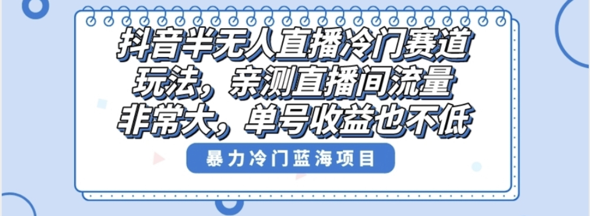 正文 抖音半无人直播项目,直播间流量大,单号收益也不低 公众号推广接单平台 V评论者 /2024-01-18 08:39:34/2.34 K阅读/0评论 0118 抖音半无人直播冷门赛道玩法,直播间流量非常大,单号收益也不低!.项目介绍今天这一期,我主要给兄弟们分享一个最近抖音半无人直播的冷门赛道的玩法,亲测像这样的直播间流量非常大,而且单号收益播一整晚下来也不低!课程目录:1、项目介绍2、准备+实操3、项目变现4、项目资料合作要求适合大学生,宝妈 上班族收益利润单日300➕费用说明需要电脑➕实名验证的抖音号扶持培训保姆级课程教学