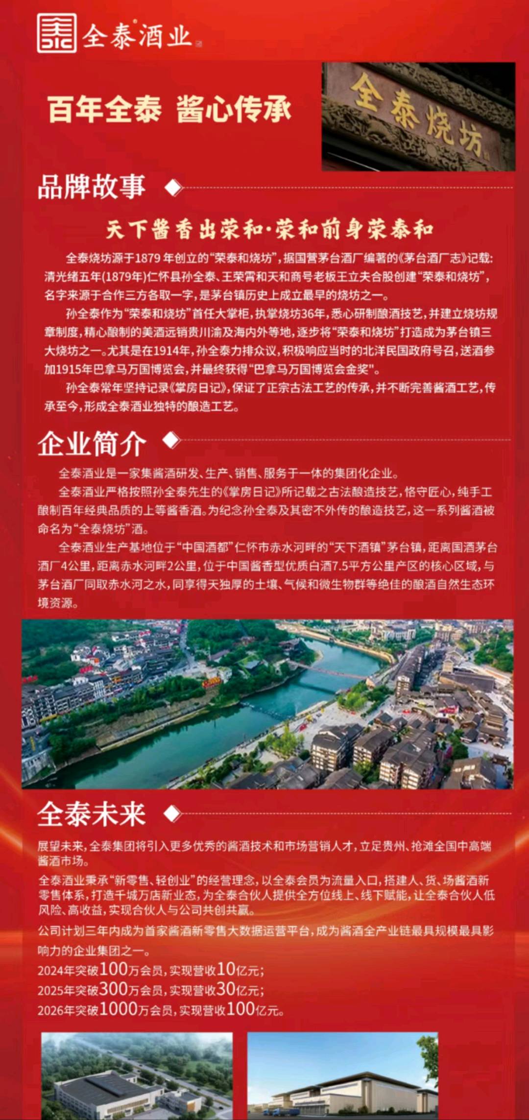 有梦想,正在寻求机会的人,这是百年难遇的一次机会,全泰酒业是一家集酱酒研发、生产、销售、服务于一体的集团化企业。现在全国招经销商,免费送客户一瓶价值799的酱香白酒,公司奖励100-180元