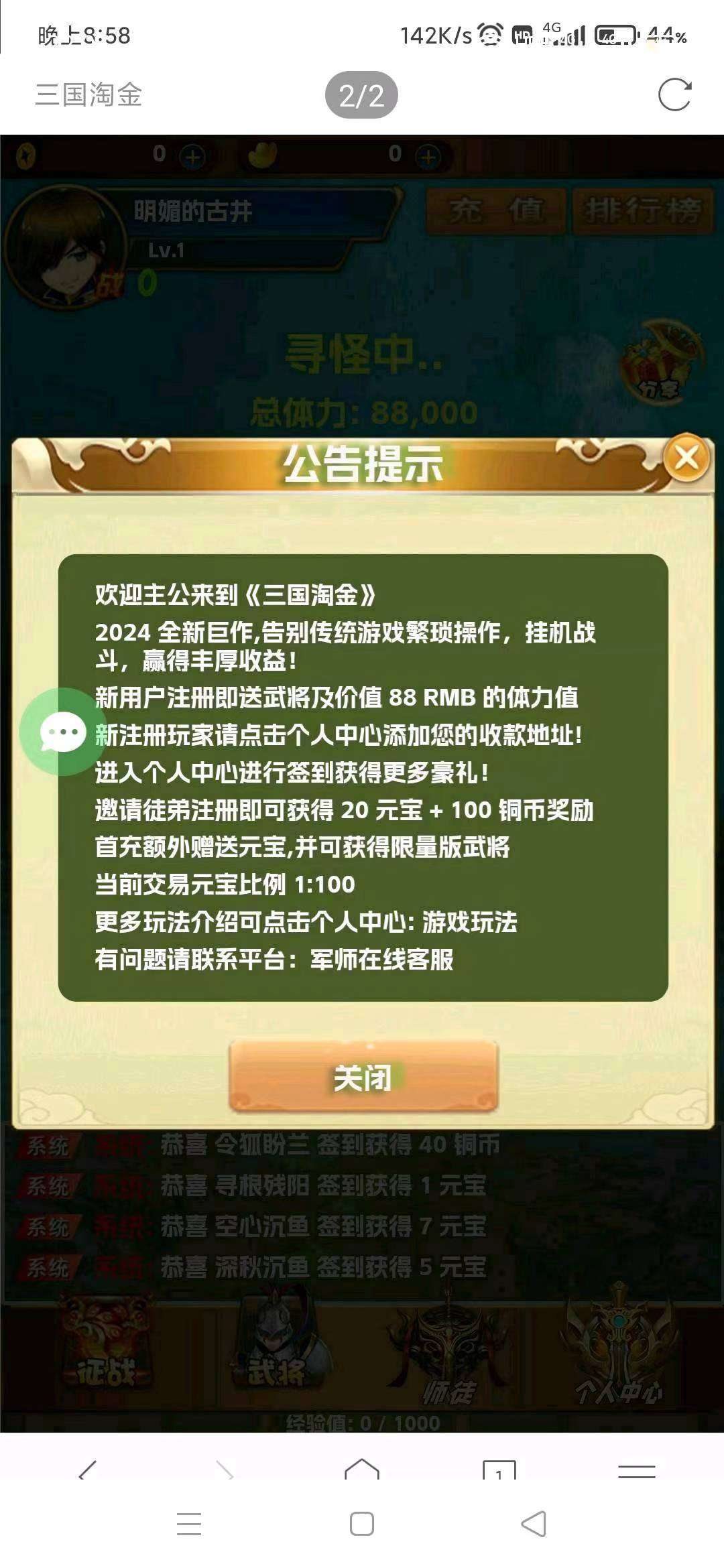正文 三国淘金正在空投,注册即送一级武将及价值88米的体力值,收益高 白小纯 V评论者 /2024-02-06 08:26:00/1.41 K阅读/0评论 0206 《三国淘金》注册得一级武将及价值88元的体力值自动打怪获得元宝元宝可出售(最低200元宝出售)rmb与元宝为1 :100 元宝,1 元宝=10铜币 元宝可以通过充值、日常签到。零撸,提现可zfb