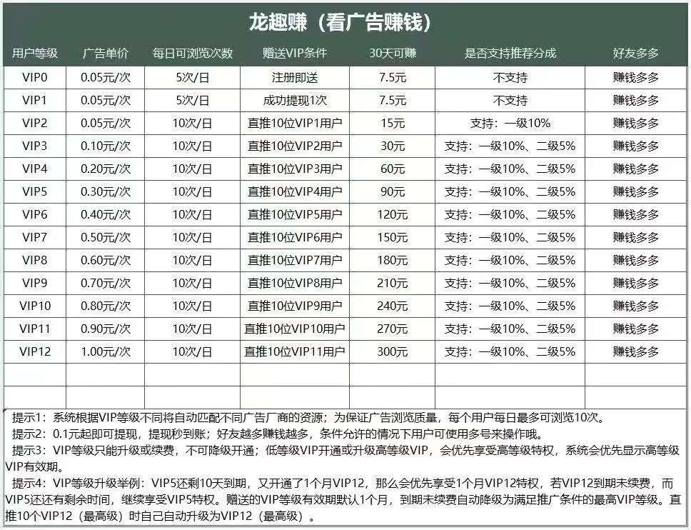 正文 龙趣赚首码,看广告赚钱,注册送vip收益高,刚出一秒 白小纯 V评论者 /2024-02-25 19:14:49/1.52 K阅读/0评论 0225 【龙趣赚】实名认证,每天5广告得0.25元,支付宝提现秒到账。推广升级至VIP12每天10广告收益10元。直推10%,间推5%广告收益提成。