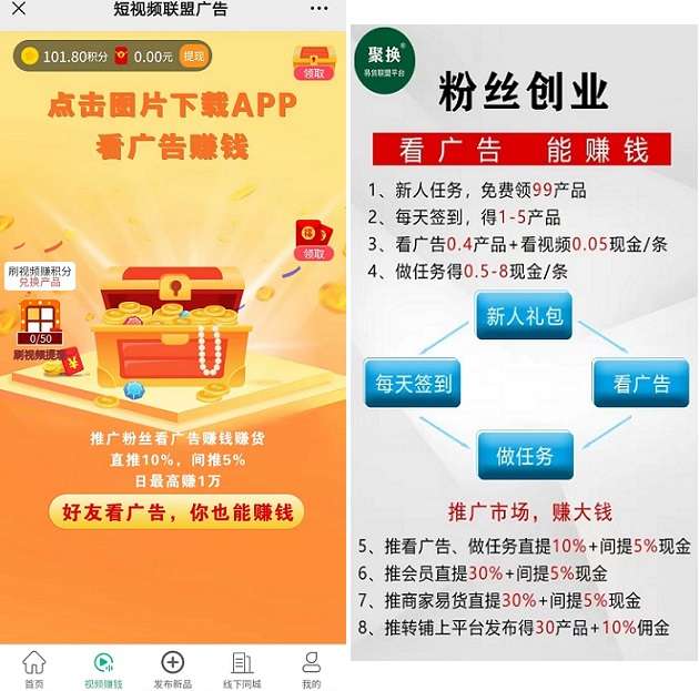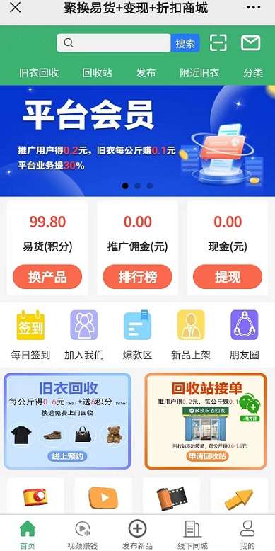 易货联盟,注册送99积分,不要的旧衣服可以回收换钱,快递员免费上门回收,每天55个广告既有佣金也有用积分,佣金可直接提现,提现无门槛,积分可以折扣买产品。