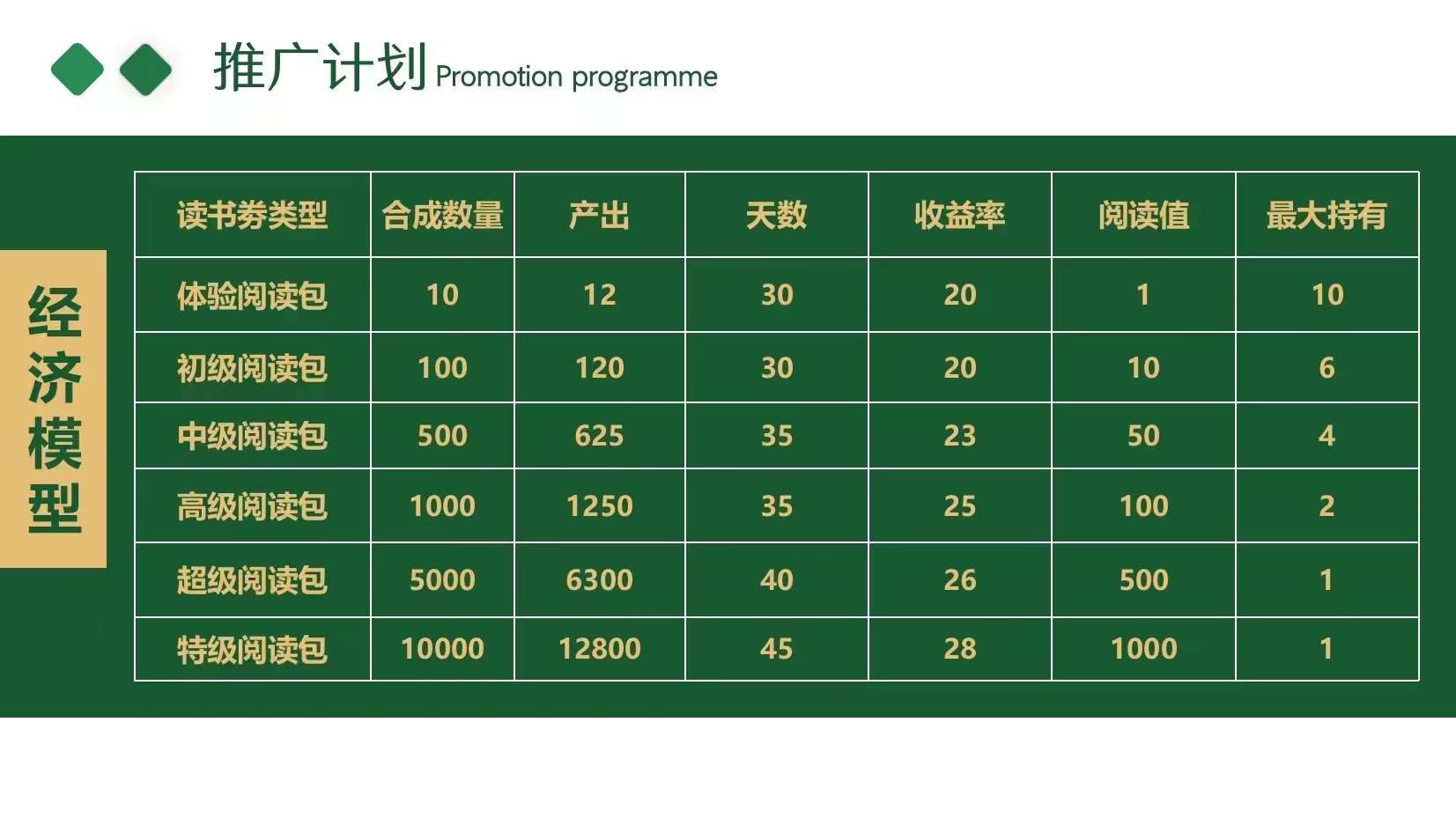 阅读包:阅读值比例是10:1,举例:免费用户可获得体验阅读包=1点阅读值,100个书卷合成初级阅读包10点阅读值,以此类推。团队越大阅读值增加速度越快。