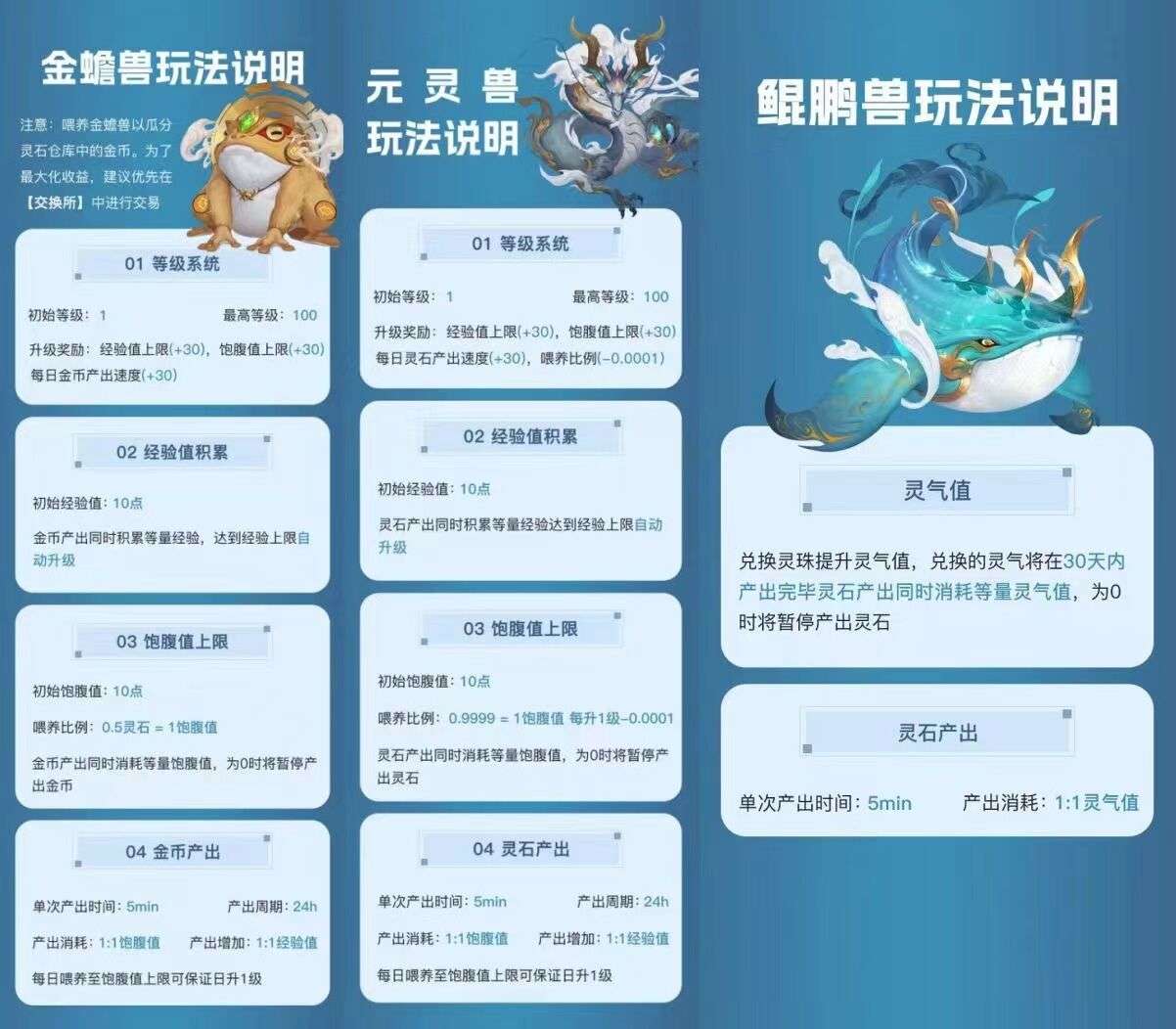 金蟾兽:可通过灵石喂养,每喂养一颗灵石,玩家可获得金b奖励。金蟾兽的等级也可提升,提升后每日产出的金b数量会增加。