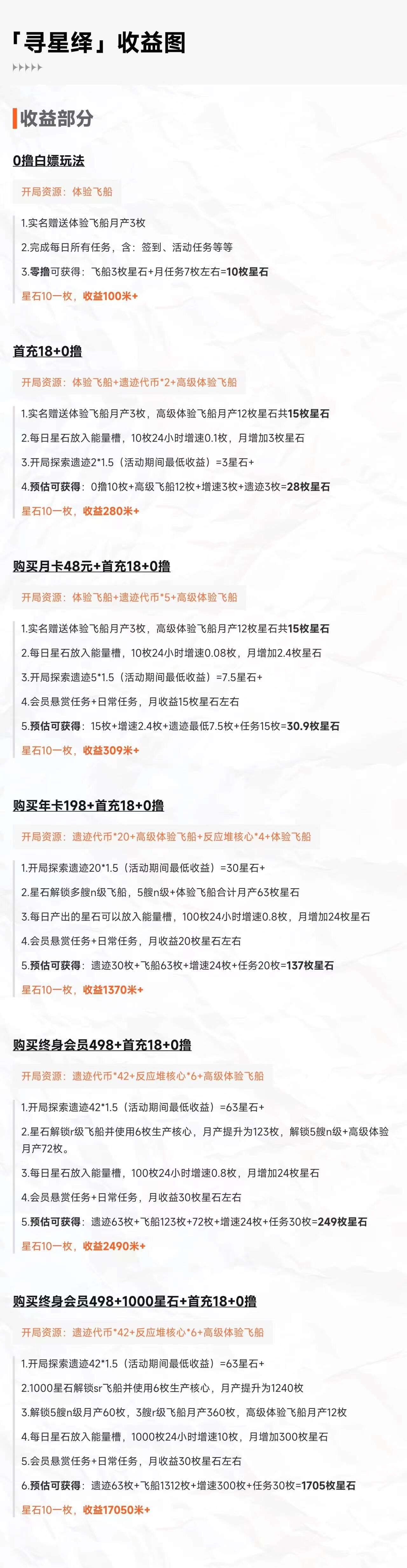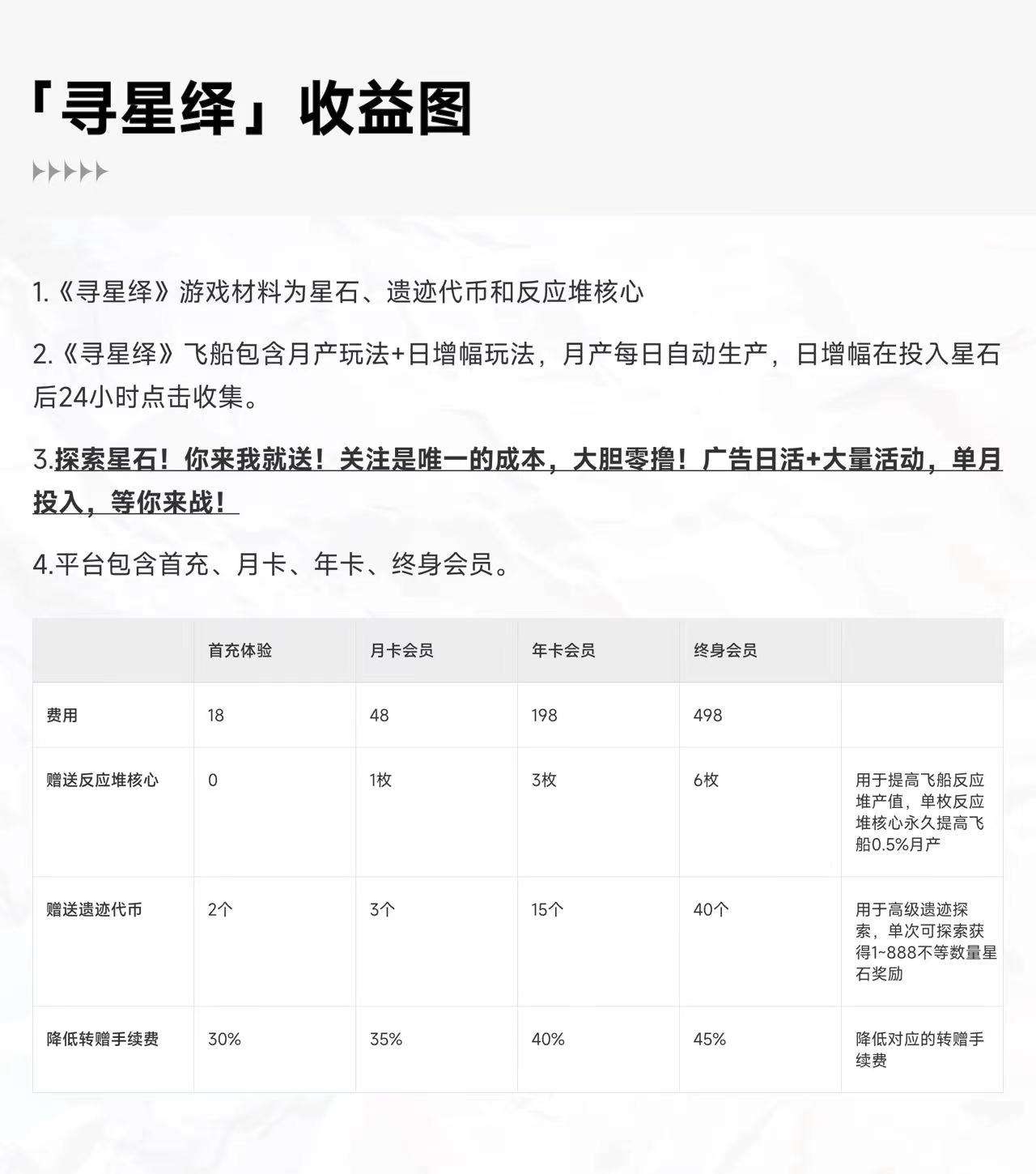 2024年4月11日正式启航,新用户将获赠体验飞船,每月产出3颗星石。每日签到和完成活动任务可额外产出7颗星石。首次18圆即可额外获得高级体验飞船,每月额外产出12颗星石,并可探索遗迹获得3颗星石。月咔、年咔和终身咔的收溢更高,星石的从3圆起步!