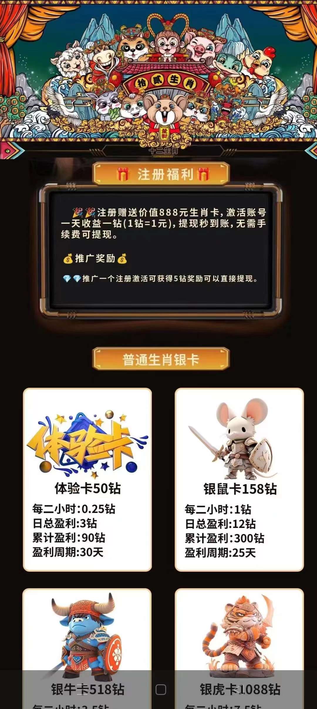 生肖金卡首码,注册赠送价值888元生肖卡,激活账号一天收益一钻(1钻=1元),提现秒到账:无需手续费可提现。推广奖励
