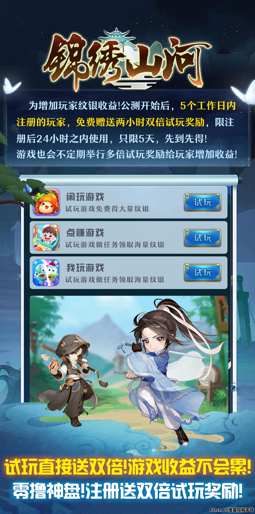 并且为利于推广!公测前5天!所有新注册的玩家拥有2小时双倍试玩奖励!推广奖励直接拉满!