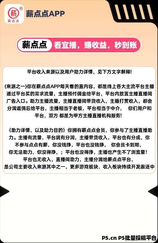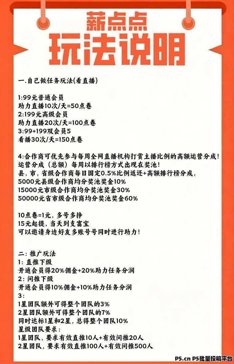 正文 薪点点首码,零撸看客帮模式,团队级别,通过助力赚 白小纯00033 V作者 /2025-10-05 09:19:02 /68 阅读 1005 薪点点零撸,看客帮模式。保底收益高,团队模式,邀请日入千米,99米普通会员助力直播10次/天得50点券。199高级会员助力直播20次/天得100点券。10点券=1米,15起提当天到,还有县市省合作商可拿。浏览器扫码