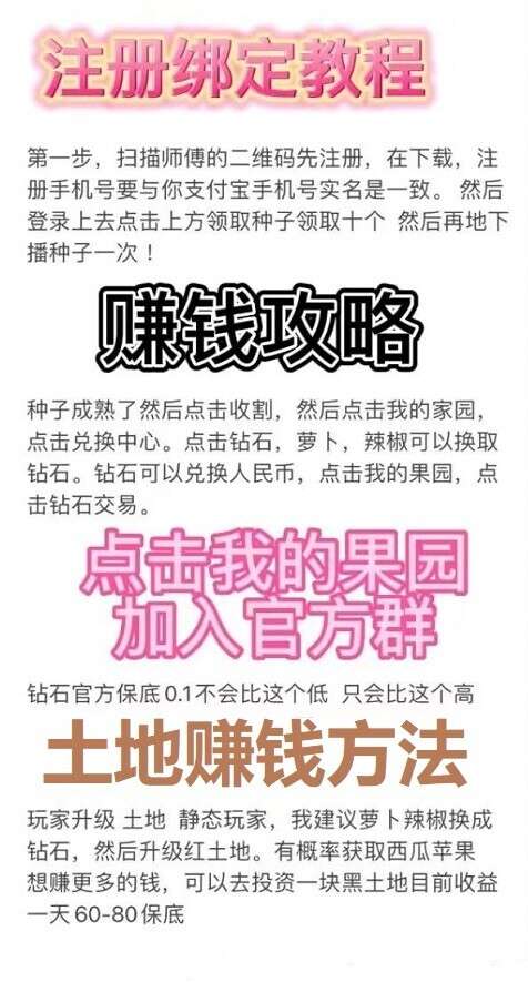 现在排行榜可以偷菜,最垃圾的萝卜和辣椒150个可以换10个钻石,保底1元,萝卜辣椒可以换成钻石,然后用钻石买材料升级红土地,红土地有概率获得西瓜苹果,想赚更多可以投资一块黑土地,日保底60-80元。
