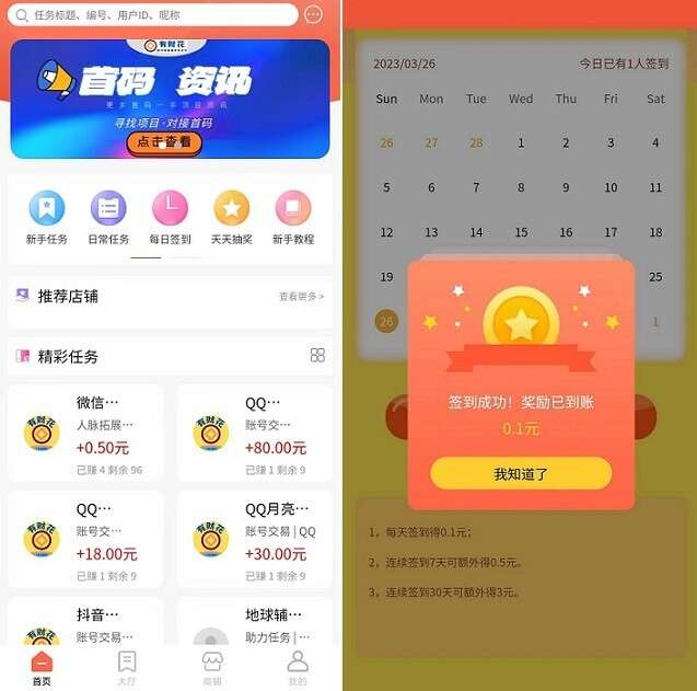 有加群加人任务,也有收号任务,每天签到奖0.1元,连续签到7天额外奖励0.5元,一个月额外奖励3元。