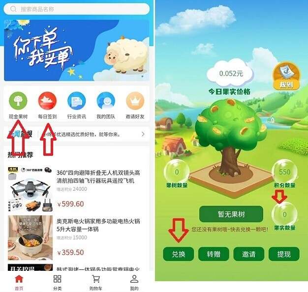 首页每天签到得积分,进入现金果树用注册送的500积分兑换1棵果树,果树每小时产1果子,每个果子现价值0.052元,每10个小时需要领取1次,不领就不继续产出了。