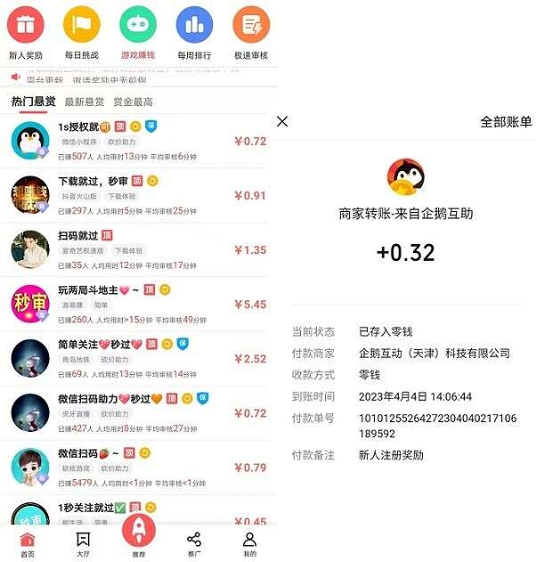 任务多种类全,注册秒推0.3-0.7元的红包。