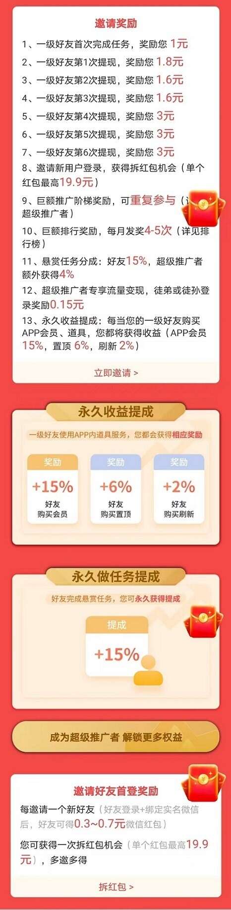直推首次提现奖1元,第二次提现奖1.8元,连续奖励6次共15元,任务永久分成15%,每邀请1人绑定微信,他得0.3-0.7元,你得最高19.9元的红包。