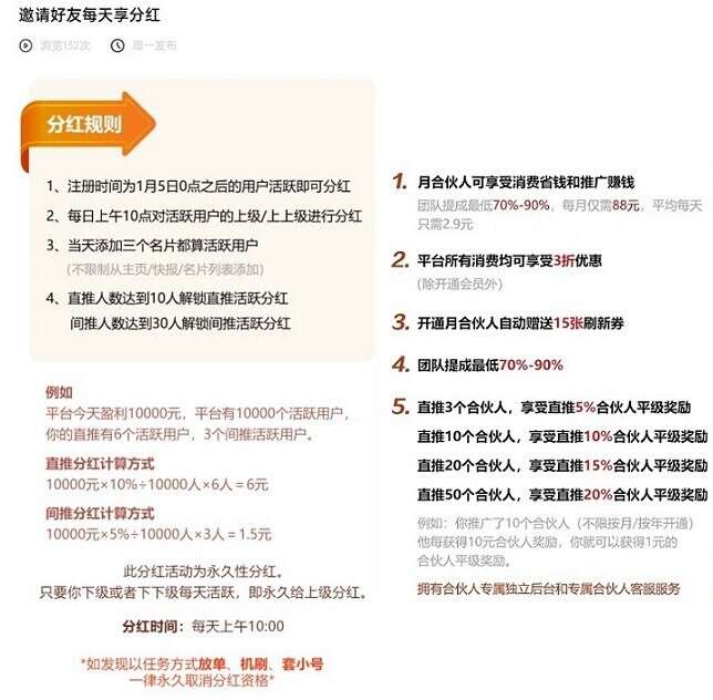 正文 千奇引流:引流必备,邀请10人永久每日分红,10元起提 xd3042 V评论者 /2023-04-04 22:04:37/2.6 K阅读/0评论 0404 千奇引流,是刚出的引流宣传平台,邀请10人永久每日分红,每天添加3个名片即可领取每日活跃分红,邀请好友越多每天分红越多,开通合伙人免费发布,享团队提成70%-90%,10元起提。VX扫码注册:可以随时随地发布自己的项目,每天添加3个名片可以平分平台的红包。直推10人获得平台直推活跃分红,间推30人获得间推活跃分红,开通任意合伙人或者会员都可以无限发布项目,直推合伙人达到人数要求,享5%-20%平级奖励。
