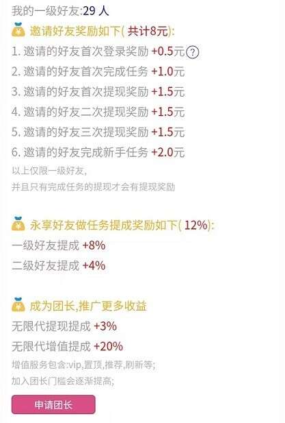 邀请2级提成,直推8%,间推4%,邀请10个活跃直推可升级为团长,拿无限代3%奖励,下级做单,放单,刷新,置顶都有收益。