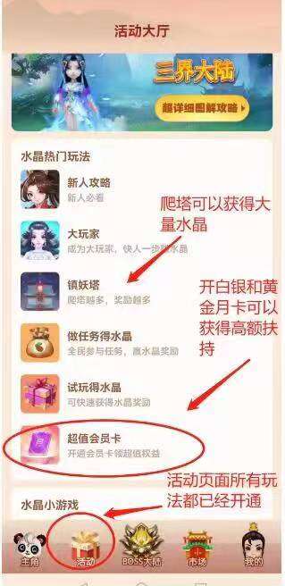 三界大陆玩法攻略目前主要是大陆挂机的玩法其他主要玩法会陆续上线只要你解锁的大陆多,每R收益就越来越多解锁到9大陆每R可领取1-9大陆挂机丹各一枚运气好一天就回本各大陆爆率真实,均可无消耗模拟操作看项目好不好主要看造血能力和能不能良性循环三界大陆每R水晶消耗大于产出每半个月所有产出减少10%水晶必然会越来越贵,预测半年到一年会在5元上下零撸玩家可以通过悬赏和试玩获得水晶投资玩家可以在其他玩家手里买或者参加一些高质量活动