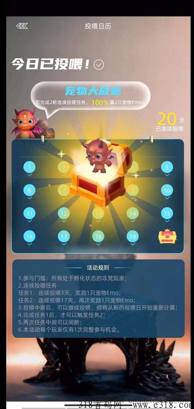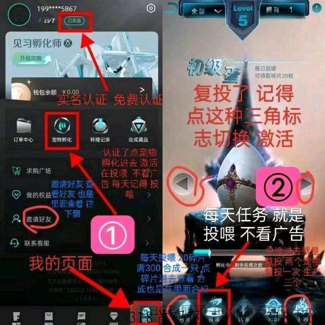 APP内自带买卖交易市场,签到17天在送1只宠物,共20天 获得2只、另外初级蛋通过碎片兑换产出2只,共4只84元。也可以复投,两只宠物可以兑换一个白蛋来产出三个宠物,不断复,收多多。可复!