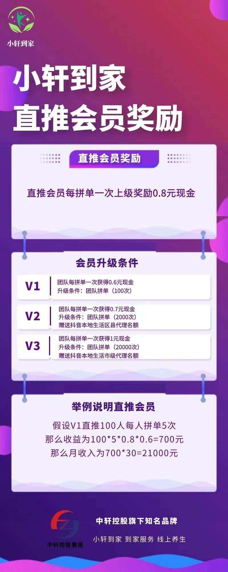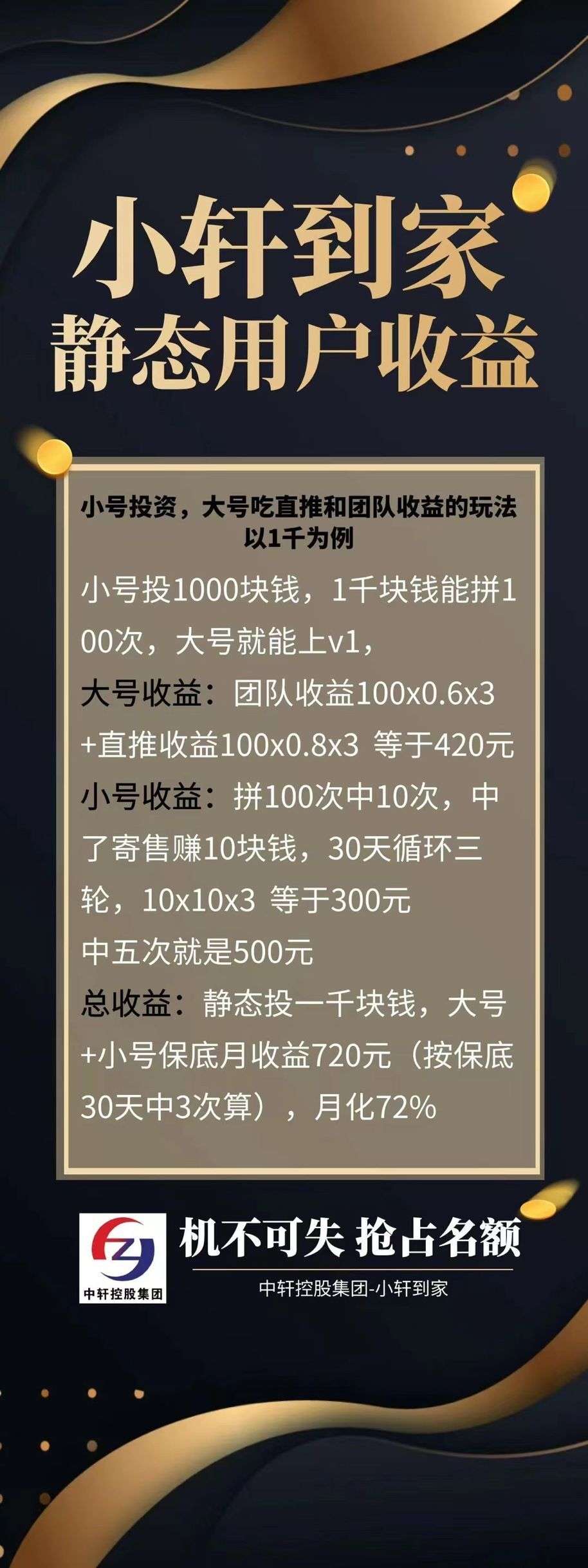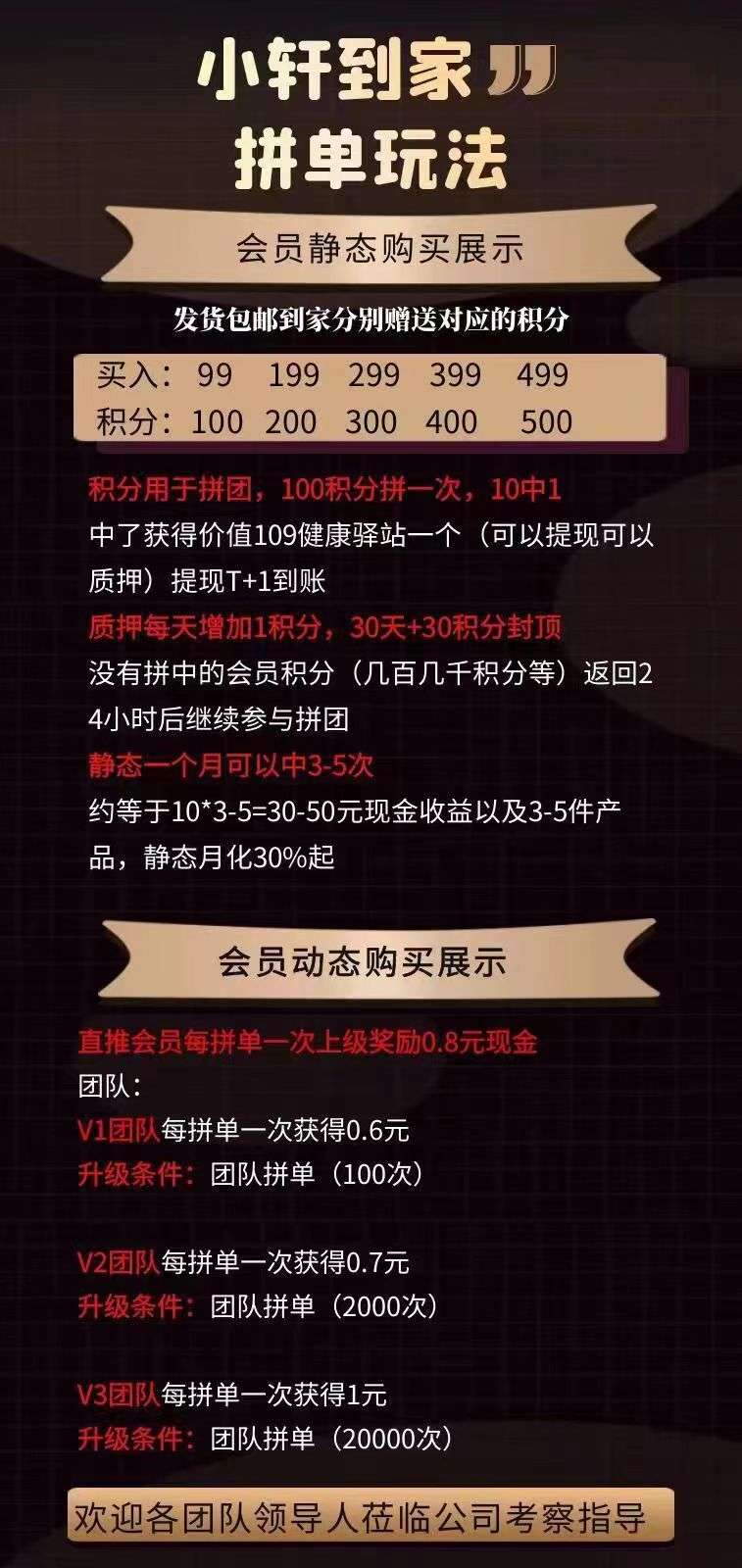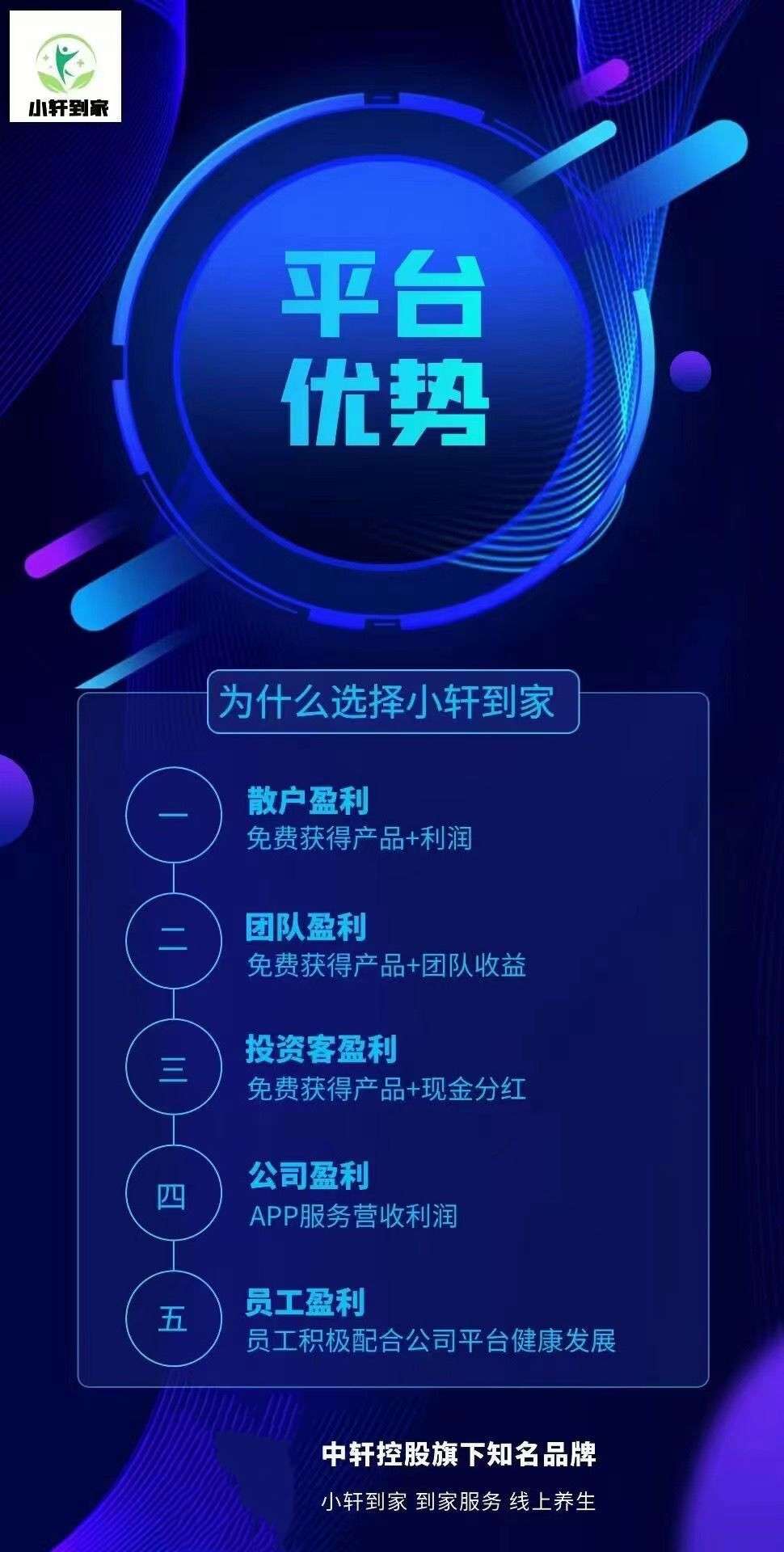 小轩到家,中轩集团旗下平台,公司在临沂,接待考察,安排常驻。买产品送积分,最低99入场,100积分拼单一次,10中一,拼中寄售获取利润,运气好当天拼中获得利润,日化10%。纯静态月化72%,动态月化最高54%。积分可拼单,可兑换抖音区域代理,也可兑换通证。通证可在二级市场交易及兑换按摩代理及按摩服务。对集团自有大健康产品,抖音代理外卖团购营业额分红已经上门按摩服务收益托底,三大板块收益保障平台长久运行,APP上线当天直接落地。