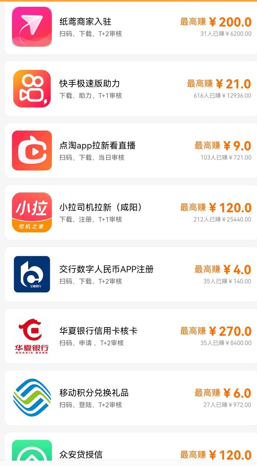 2、价格:纸鸢商家入驻200元,小拉司机拉新120元,众安贷授信120元,京东极速版拉新18元,抖音极速版拉新18元,小米商家入驻120元等等…